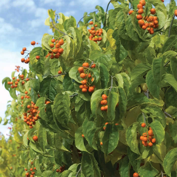 P.P. 19811 Ornamental fruit without a pollenizer. Unlike common American bittersweet, this variety has perfect flowers that include both male and female parts so you need only one plant for fruiting. The fruit is abundant and the berries are twice as large as the straight species. Bright orange to red berries is displayed against glossy foliage. Berries are used for ornamental purposes only. They are poisonous to humans, but can be enjoyed by birds.